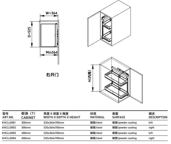 柜体:400mm 宽度 X 深度 X 高度:525x364x700mm